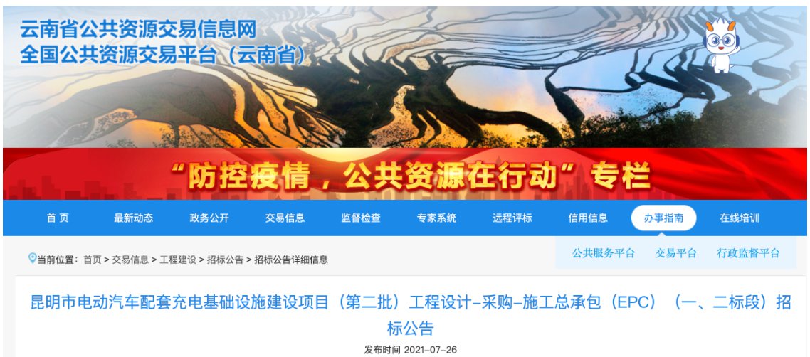 7月26日,昆明發(fā)展新能源產(chǎn)業(yè)投資運營有限公司發(fā)布昆明市電動汽車配套充電基礎(chǔ)設(shè)施建設(shè)項目(第二批)工程設(shè)計-采購-施工總承包(EPC)(一、二標段)招標公告。