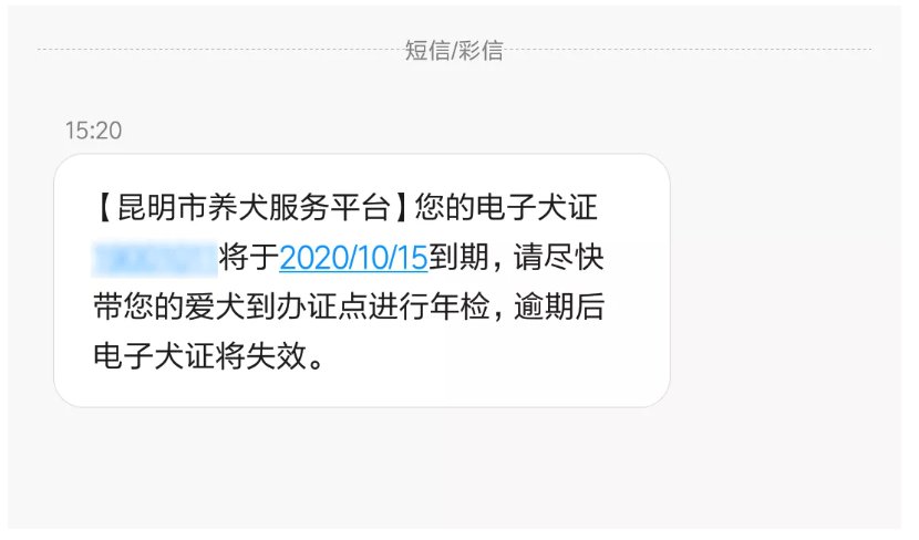 已辦理電子犬證(自登記日期起,有效期為12個月),當(dāng)電子犬證有效期不足1個月時,平臺會發(fā)送短信提示犬主。