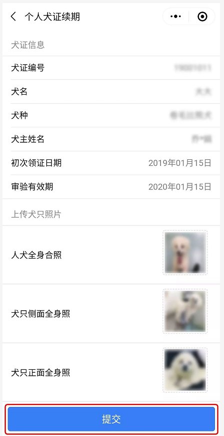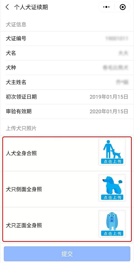 4、經(jīng)過一年,愛犬已經(jīng)長(zhǎng)大啦,請(qǐng)?jiān)谏戏街匦律蟼鹘谀c愛犬的合照,以及近期愛犬的側(cè)面、正面全身照。好后,點(diǎn)擊下方“提交”按鈕。