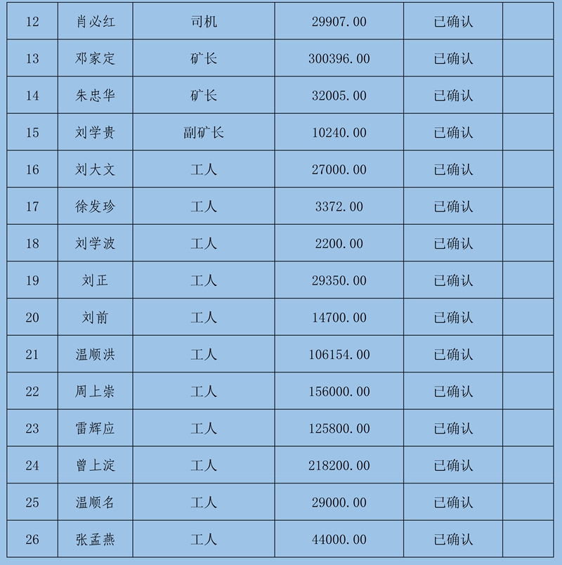 2、本次確認(rèn)情況:經(jīng)初核確認(rèn),累計(jì)共收到25條欠薪證據(jù),涉及25人742352元;勞資雙方已簽字蓋章確認(rèn)25條欠薪證據(jù);經(jīng)法人陽建華電話確認(rèn)1人16572元。煤礦方提供確認(rèn)名冊(cè)一份,其他50名欠薪人員存在以下說明:3名人員證據(jù)不足無法確認(rèn)、10名(兩個(gè)工隊(duì))待法院判決后再確認(rèn)、16名人員欠薪已支付、21名人員由于證據(jù)不足無法確認(rèn)。