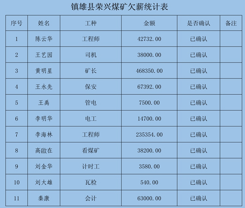 3、其他情況:煤礦方簽字認(rèn)可的216條欠薪申報(bào),均持有煤礦方開出的工資欠條(蓋章)或是法院判決書等相關(guān)依據(jù),實(shí)際用工情況無法核實(shí)。
