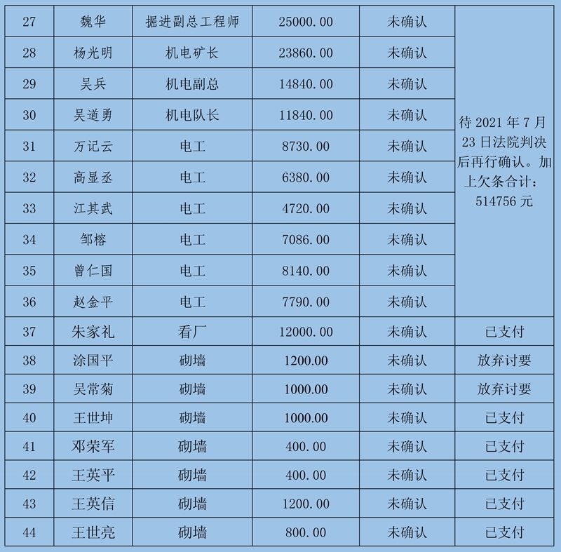 3、其他情況:登記確認(rèn)過程中魏華、楊光明兩個(gè)工隊(duì)提供欠薪相關(guān)證據(jù),但由于兩個(gè)工隊(duì)的上級(jí)主管歐秀坤已向法院提起訴訟,于2021年7月23日開庭,煤礦表示不知道歐秀坤的訴訟里面是否含兩個(gè)工隊(duì)的欠薪,待查明情況后再做確認(rèn)。