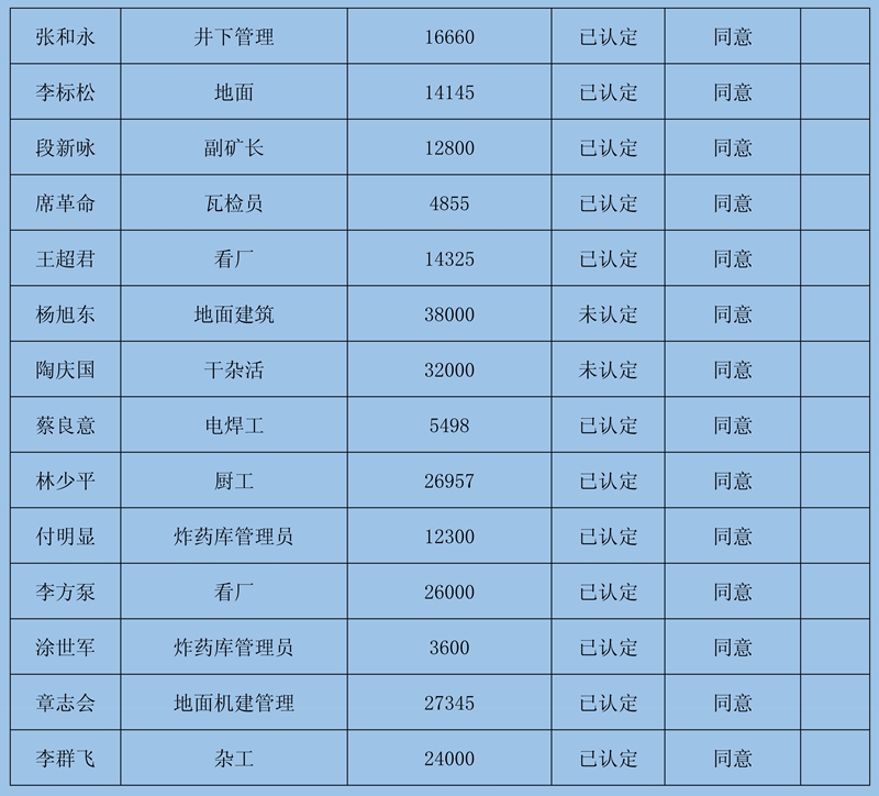 4、復(fù)核意見:建議予以確認(rèn)申報(bào)8條金額413830元;需調(diào)查核實(shí)再行確認(rèn)3條牟全書、牟全松和白啟波三人的申報(bào),當(dāng)事人未提供切實(shí)欠薪依據(jù),礦方亦不認(rèn)可;不予確認(rèn)1條劉永泉申報(bào)的欠薪經(jīng)核實(shí)為煤礦轉(zhuǎn)讓金。