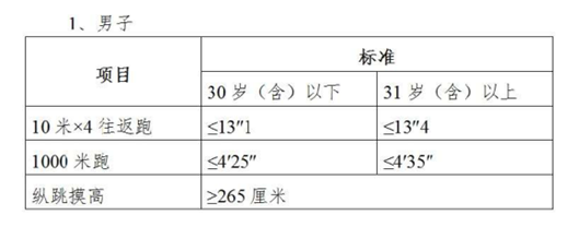 資格審核合格的人員進(jìn)入體能測試,體能測試按照公安部《關(guān)于印發(fā)公安機關(guān)錄用人民警察體能測評項目和標(biāo)準(zhǔn)(暫行)的通知》及其所附標(biāo)準(zhǔn)開展。體能測試的項目如下:
