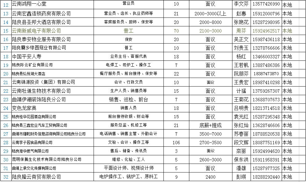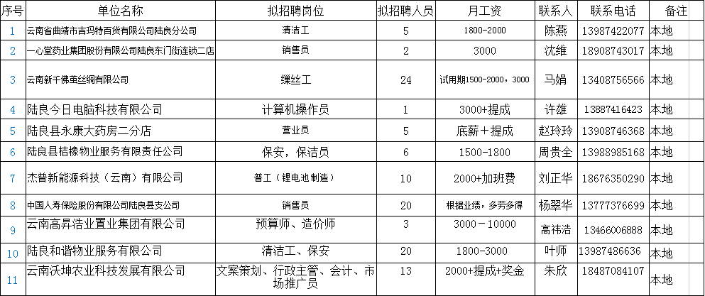 陸良縣2020年企業(yè)用工信息發(fā)布