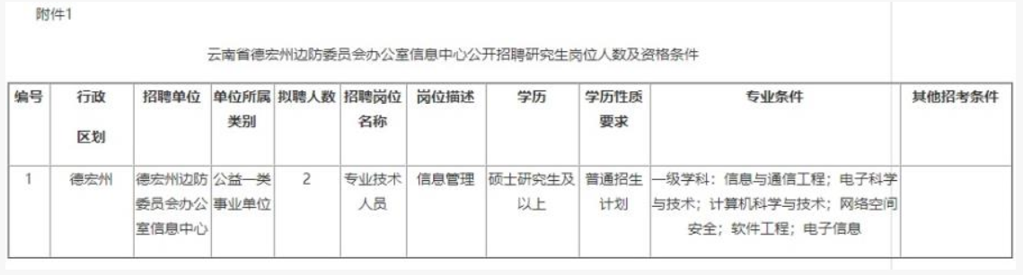 本次面向社會公開招聘碩士及以上研究生學(xué)歷人員2名(德宏州邊防委員會辦公室信息中心事業(yè)專技人員2名),具體崗位、條件、要求等詳見(附表1)。