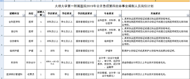 因工作需要,大理大學第一附屬醫(yī)院面向社會公開急招第四批非事業(yè)編制工作人員29名,現(xiàn)將有關(guān)招聘事宜公告如下: