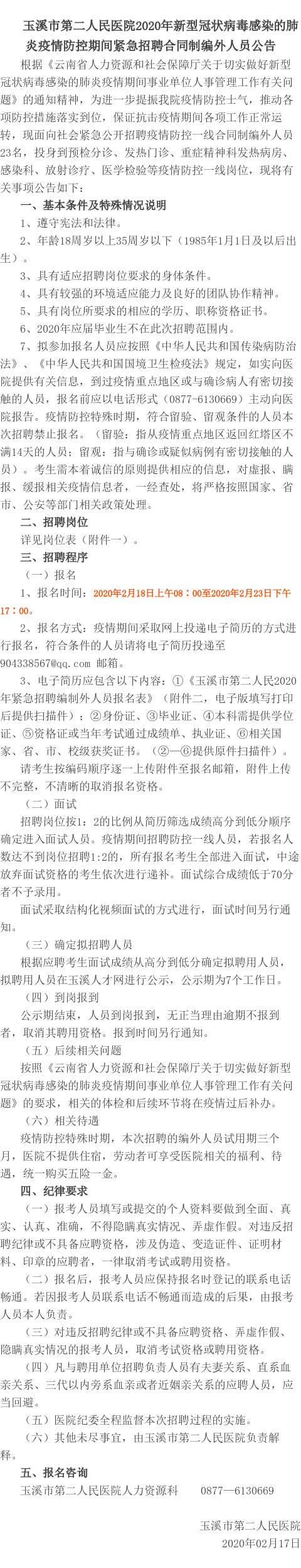 玉溪市第二人民醫(yī)院疫情防控期間緊急招聘